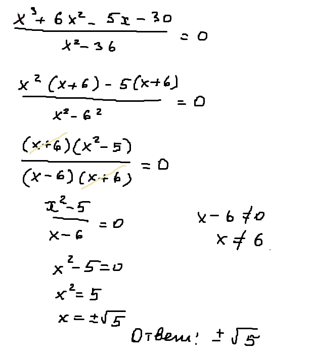x^3 + 6x^2 - 5x - 30 / x^2 - 36 = 0