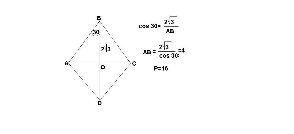 один из углоа ромба ровняется 60 градусов, а диагональ, проведенная из этого угла, равняется 4 корень 3. Найти периметр ромба