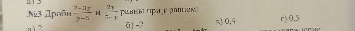 Приравниваем 1-ую дробь ко 2-ой и решаем по правилу креста: (2-3у)*(5-у)=(у-5)*2у Сокращаем, получается квадратное уравнение у^-7у+10=0 Пропустим решение, получается: х1=5; х2=2 Если надо само решение, напиши.