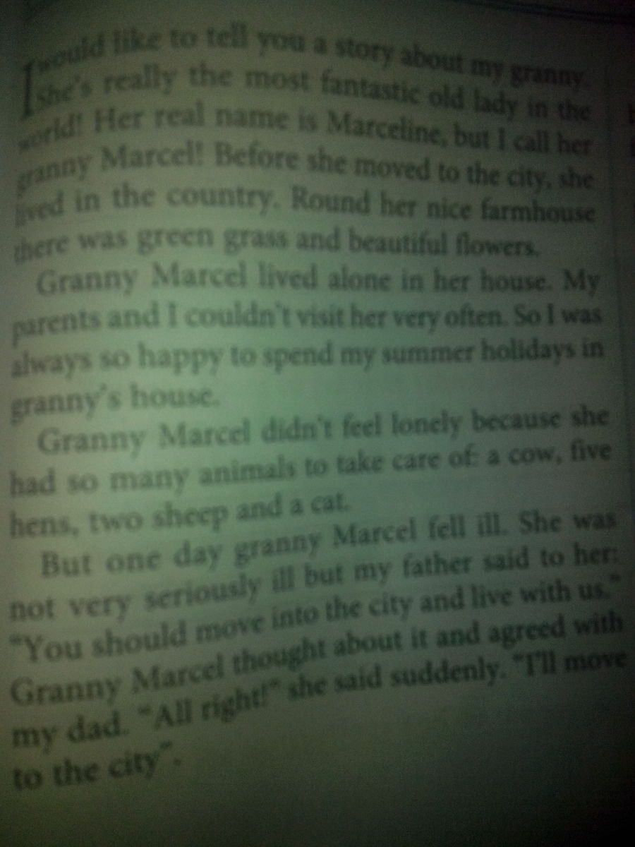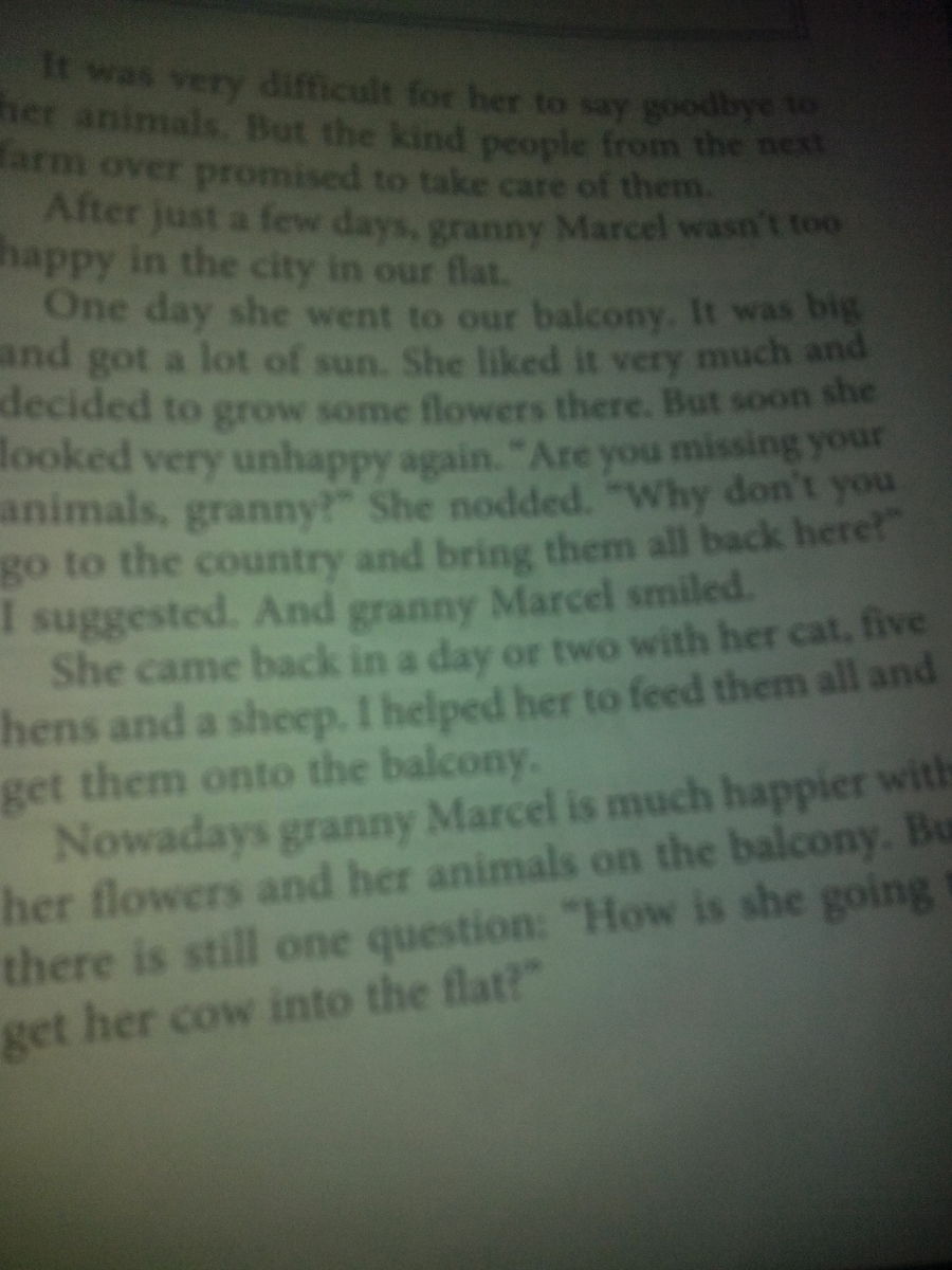 Но однажды бабушка Марсел заболела. Она была несерьезно больна, но мой папа сказал ей:" Тебе следует переехать в город и жить вместе с нами."Бабушка подумала об этом и согласилась с папой."хорошо",-вдруг сказала она,-"я перееду в город"