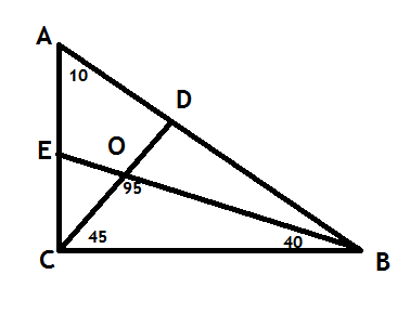 пожалуйста помоги срочно...У прямокутному трикутнику ABC (кут C=90 градусів) бісектриси CD і BE перетинаються в точці О, кут BOC= 95 градусів. Знайти гострі кути трикутника АВС