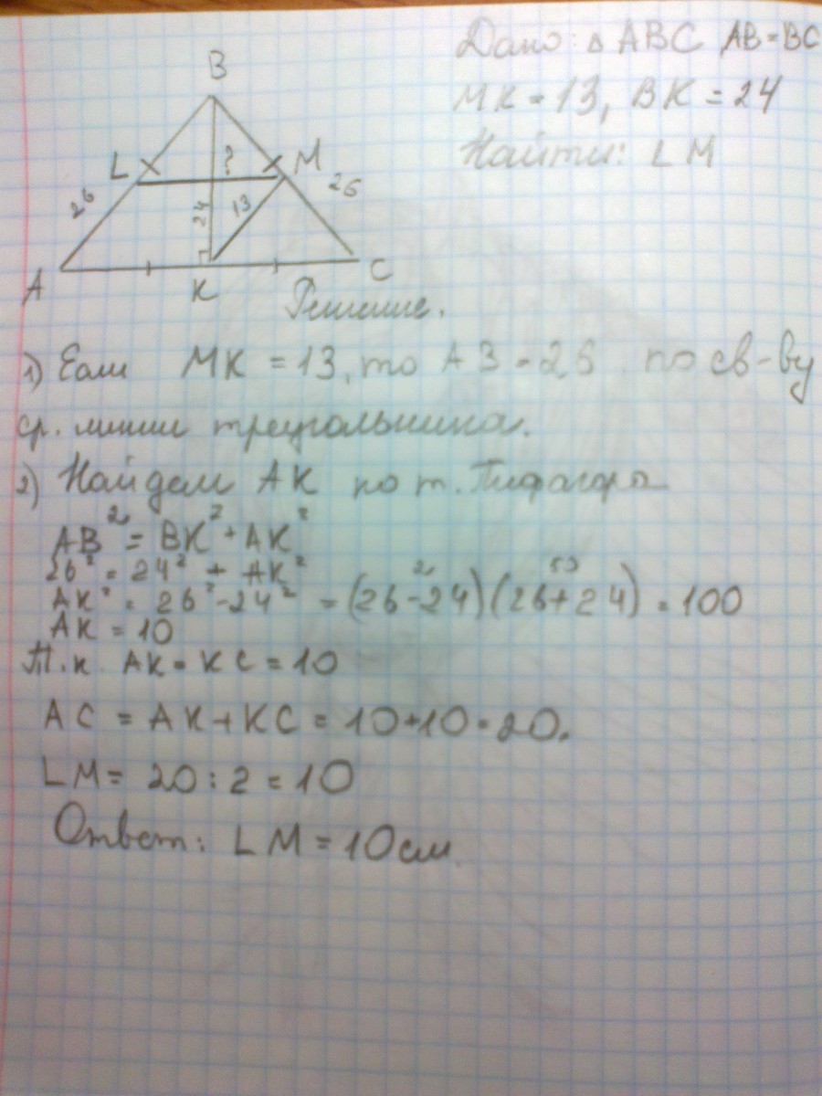Средняя линия равнобедренного треугольника параллельная боковой стороне равна 13 см а медиана проведенная к основанию 24 см найдите среднюю линию параллельную основанию треугольника