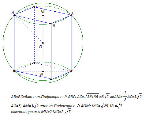 Правильная четырехугольная призма вписана в шар. Найдите высоту призмы, если радиус шара равен 5, а ребро основания призмы 6. Варианты ответов: 8. 7 корней из2. 3 корня из 5. 8 корней из 5. 2 корня из 7.