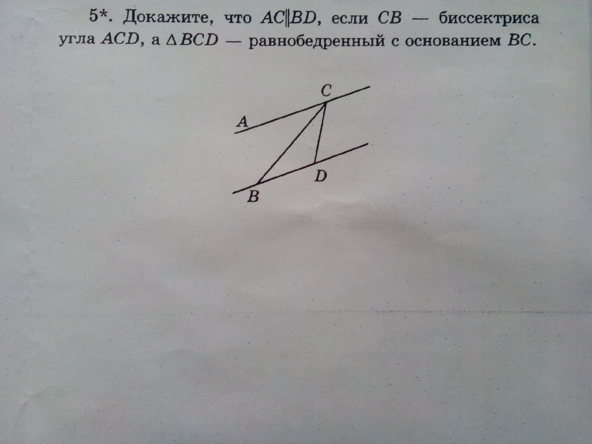 Углы АСВ и CBD - накрест лежащие при пересечении прямых АС и BD секущей ВС. Если при пересечении двух прямых секущей накрест лежащие углы равны, то такие прямые параллельны. Значит, AC II BD.