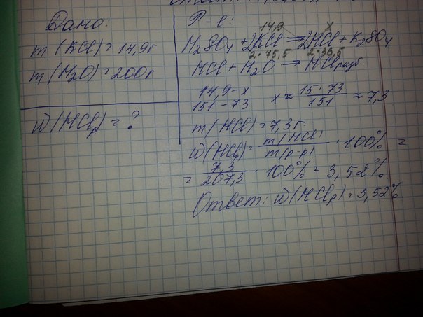 Сначала нам нужно узнать массу хлороводорода. По первому уравнению реакции мы это сделали. Затем мы рассчитали массовую долю хлороводорода по формуле: массу (растворенного вещества)/массу (раствора (воды и хлороводорода))*100%. Ответ: 3,52%. *при расчтете массы хлороводора массу хлорида калия мы округлили. :)