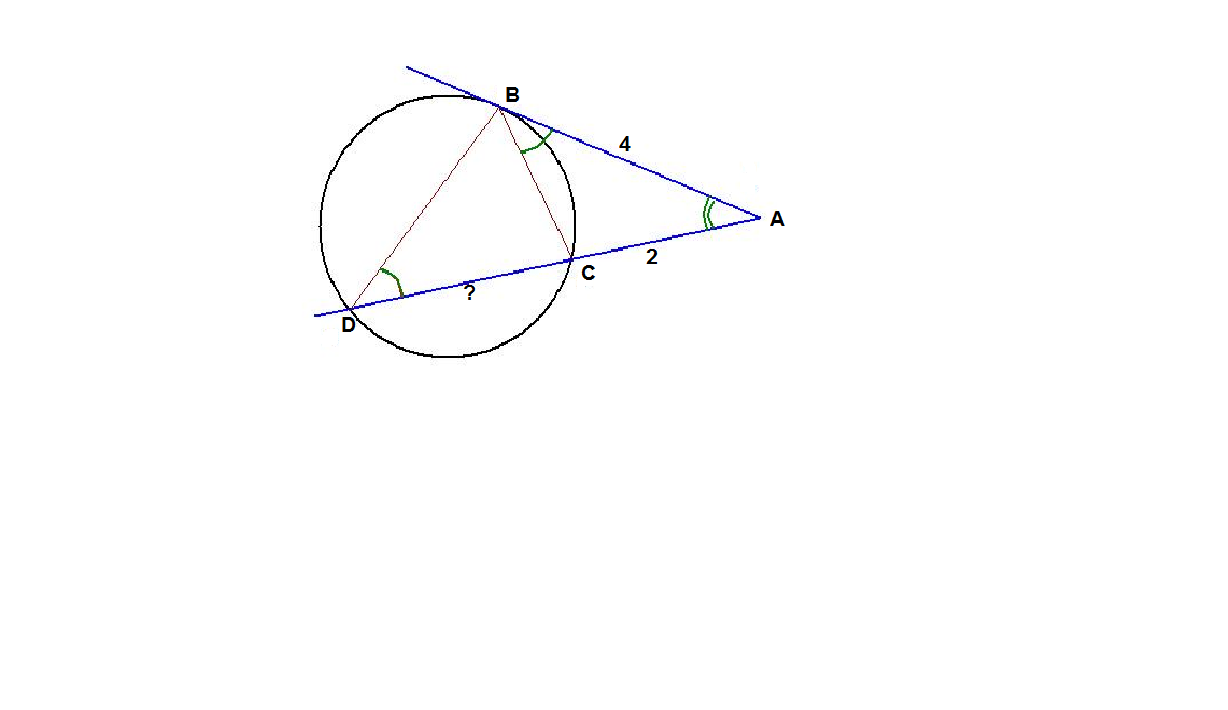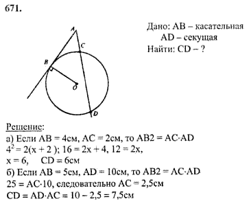 Через точку А проведенны касательная АВ (В-точка касания) и секущая, которая пересекает окружность в точках С и D. Найдите СD, если: а) АВ=4 см, АС=2 см; б) АВ=5 см, АD=10 см.
