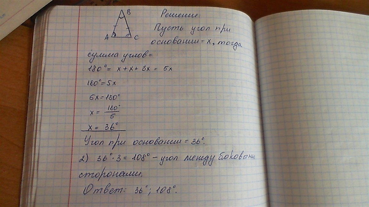 угол при основании равен 36. согласно теореме об углах треугольника, углы при основании в равноб.треугольнике равны. следовательно второй угол при основании тоже будет 36. осталось найти угол между сторонами