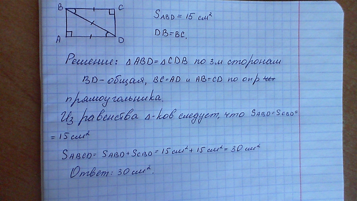 В четырехугольнике АВСД углы при вершинах А и Д прямые. ДВ=ВС, а площадь треугольника АВД равна 15 см квадратных. Чему равна площадь АВСД