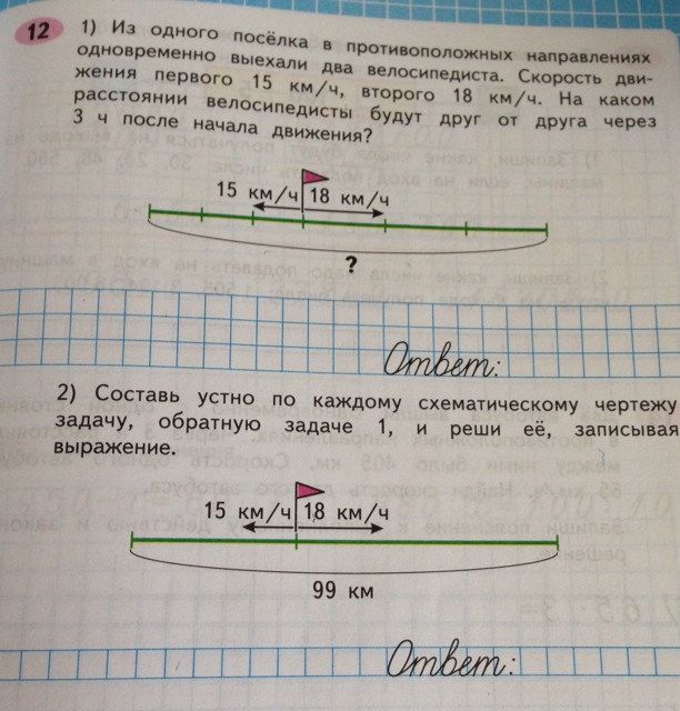 из одного поселка одновременно выехали 2 велосип.скорость первого-15км/ч,скорость второго 18км/ч.через сколько часов расстояние между ними будет 99км?