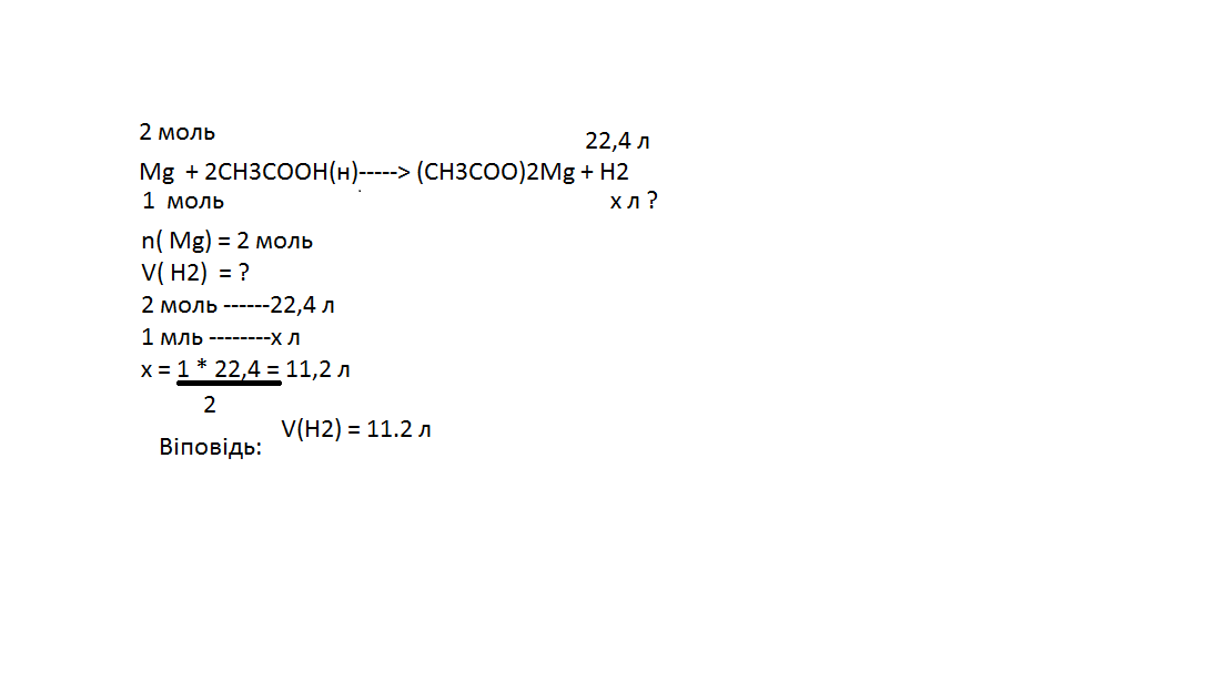 Обчисліть і вкажіть об*єм водню (н.у) який виділиться під час взаємодії 2 моль магню з оцитової кислоти,що взята з надлишку