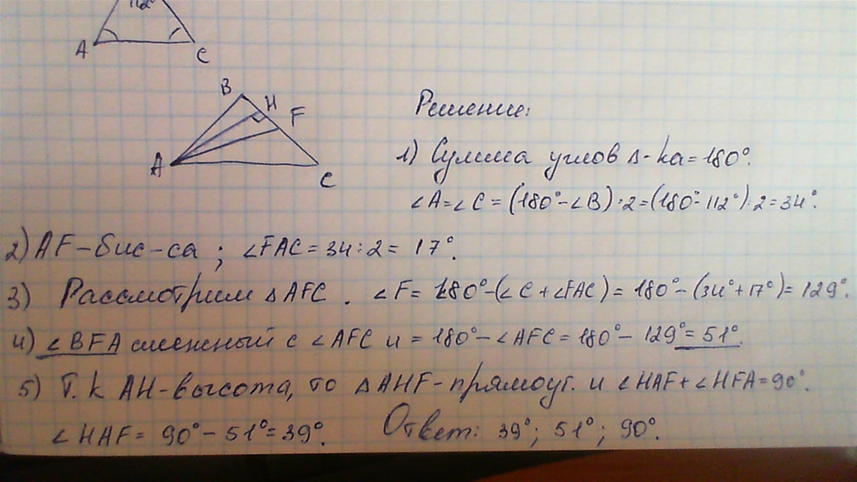 В равнобедренном треугольнике ABC с основанием АС проведены биссектриса AF и высота АН. Найдите углы треугольника AHF, если ∠B = 112°.(Чертёж прикрепите ввиде картинки)