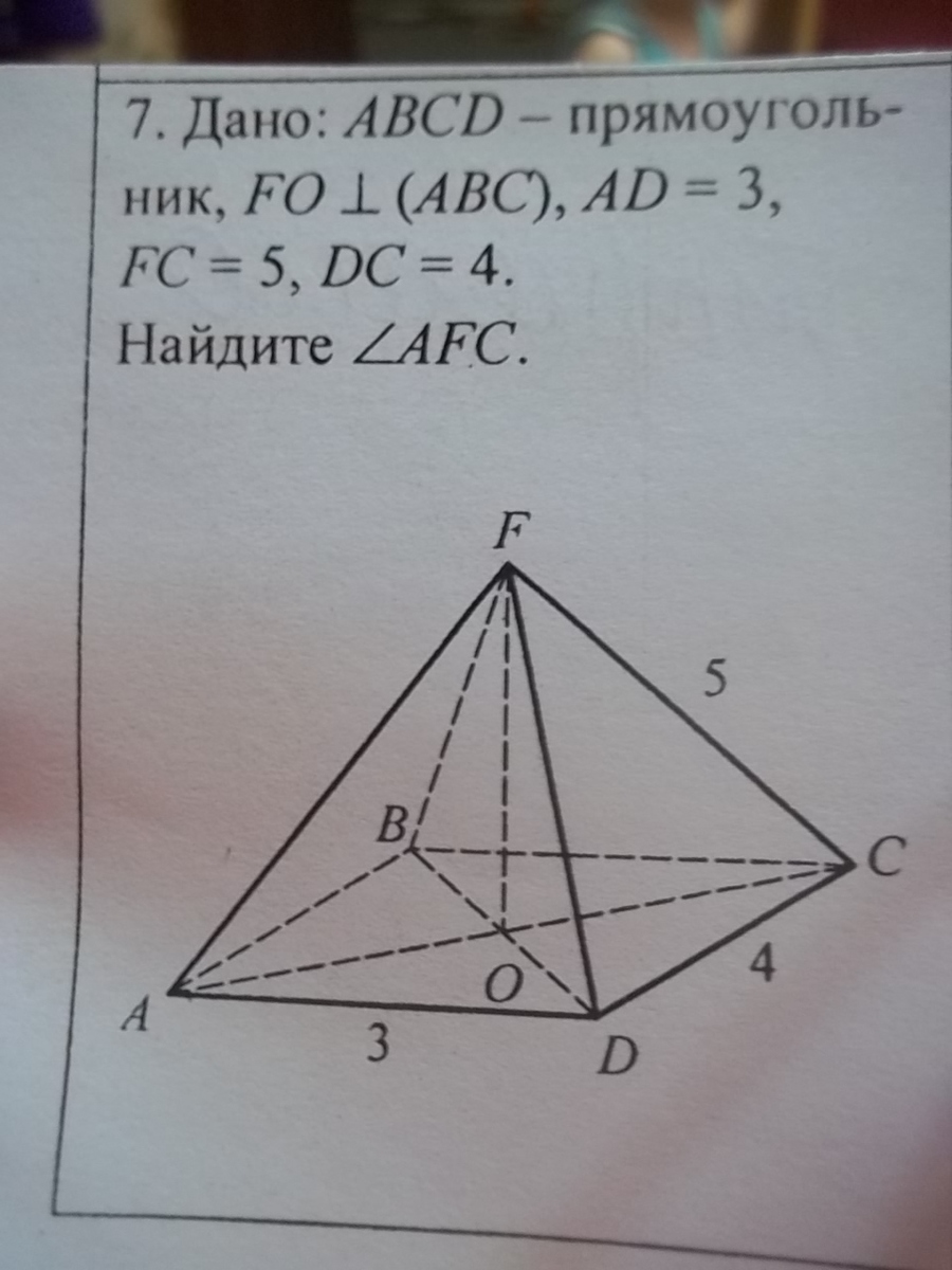 точка F равноудалена от вершин А и С, т.к треугольники AFO и CFO равны, следовательно AF=FC=5, рассмотри прямоугольный треугольник АСД, АД=3, ДС=4 следовательно по теореме Пифагора АС=5(египидский треугольник) отсюда следует что треугольник AFC-правильный , следовательно угол AFC=60