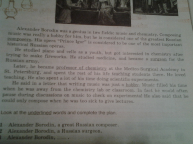 Александр Бородин был гением в двух сферах: музыка и химия. Сочение музыки было его хобби, он считается одним из величайших Русских композиторов. Его опера "Принц Игорь" считается одной из самых важных исторических русских опер.