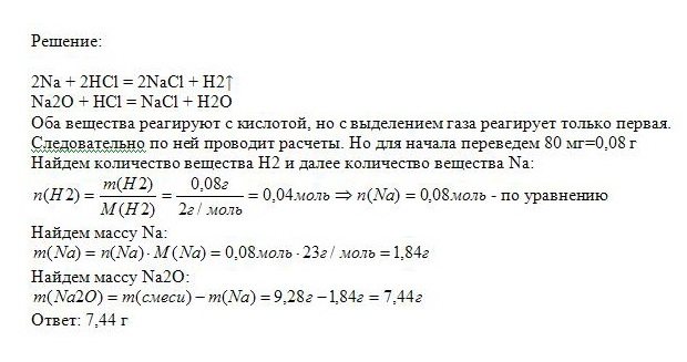 При действии на смесь натрия и оксида натрия массой 9.28 г разбавленного раствора хлороводородной кислоты, взятого в избытке, выделился газ массой 80 мг .