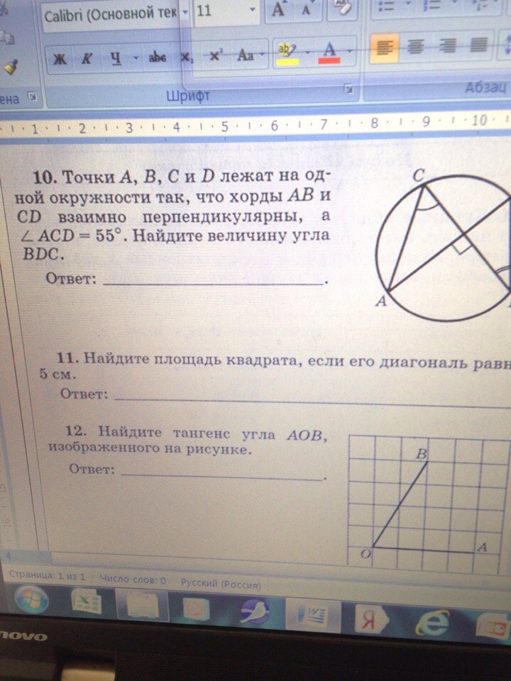 10. угол bdc=35, т.к. угол acd= 55, и у нас есть перпендикуляр кот.,=90. мы найдем угол А, по св-ву о сумме углов треугольника. 180-55-90=35. а т.к., угол А и bdc опираются на одну дугу то их величина равна