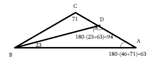 биссектриса делит угол пополам, значит он равен 23 градуса. остается найти АДВ. он равен 180-23-63= 94