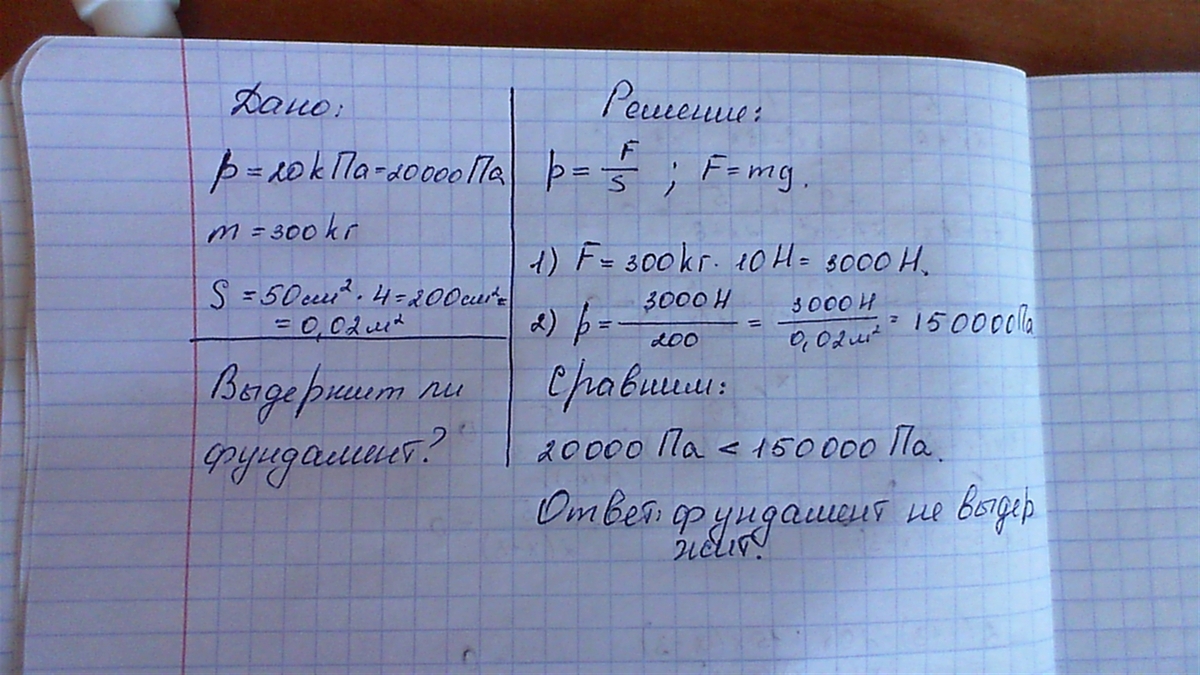 Фундамент выдерживает давление 20 кПа.Можно ли поставить на него станок,если его масса 300кг и площадь одной из четырех опор 50 см квадратных