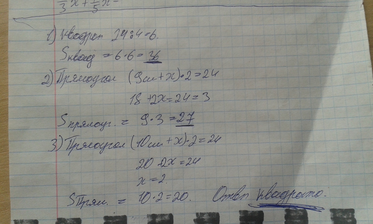 Квадрат и прямоугольник имеют одинаковый периметр- 24 см.Площадь какой фигуры больше,если длина прямоугольника 9см?1дм?