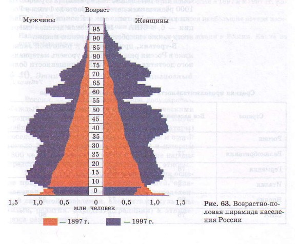 1. По рис. 63 сравните возрастно-половые пирамиды России в 1897 и в 1997 гг. Какими причинами объясняются их различия?