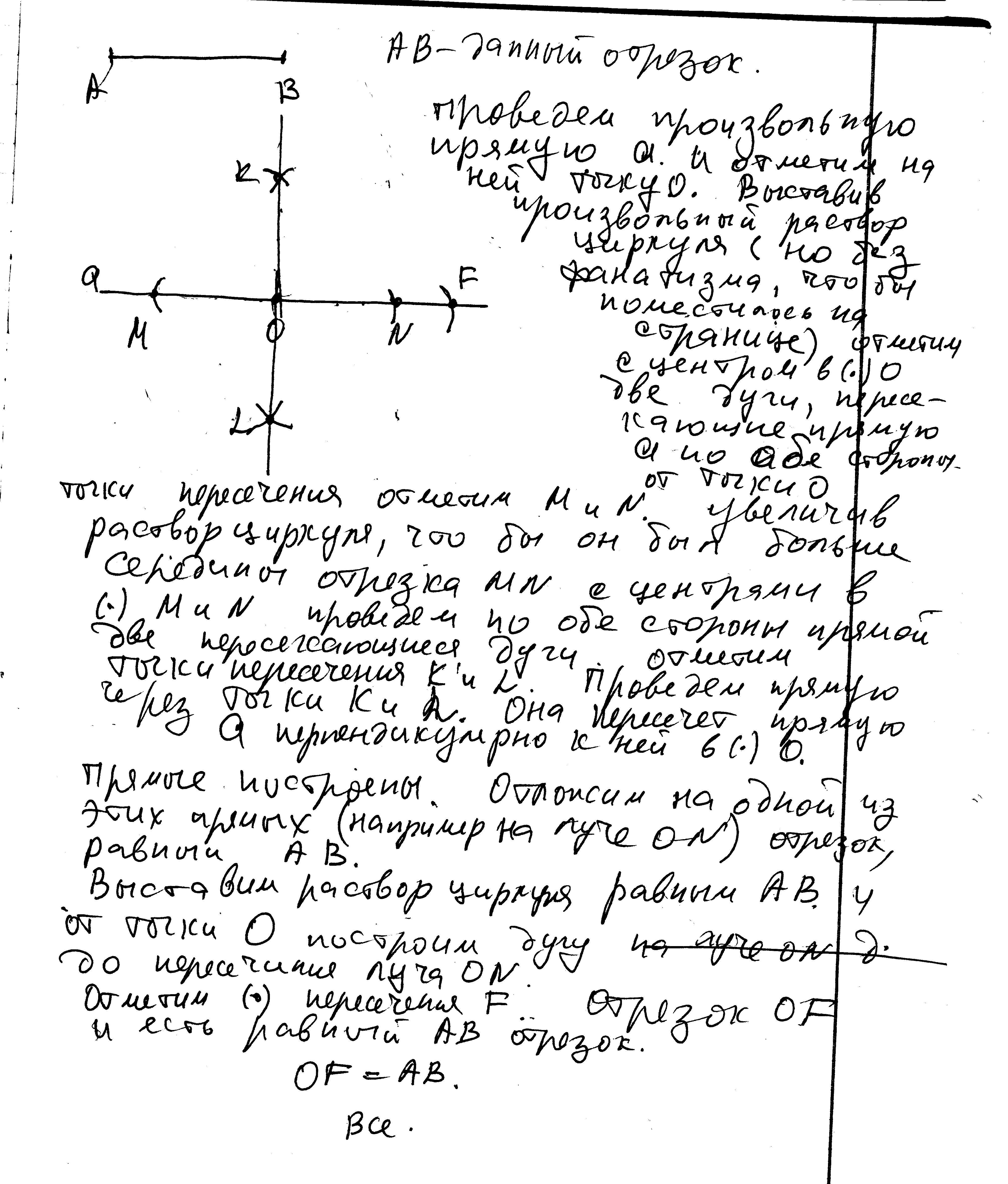 Дан отрезок.. Постройте две какие-либо взаимные перпендикулярные прямые и на одной из них от точки пересечения отложите отрезок, равный данному.