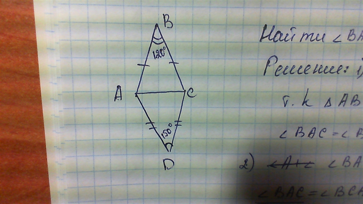 Трикутники АВС і ADC - рІвнобедрені з основою АС . Знайдіть угол BAD , якщо угол АВ = 120 градусов , угол ADC= 150 градусов .