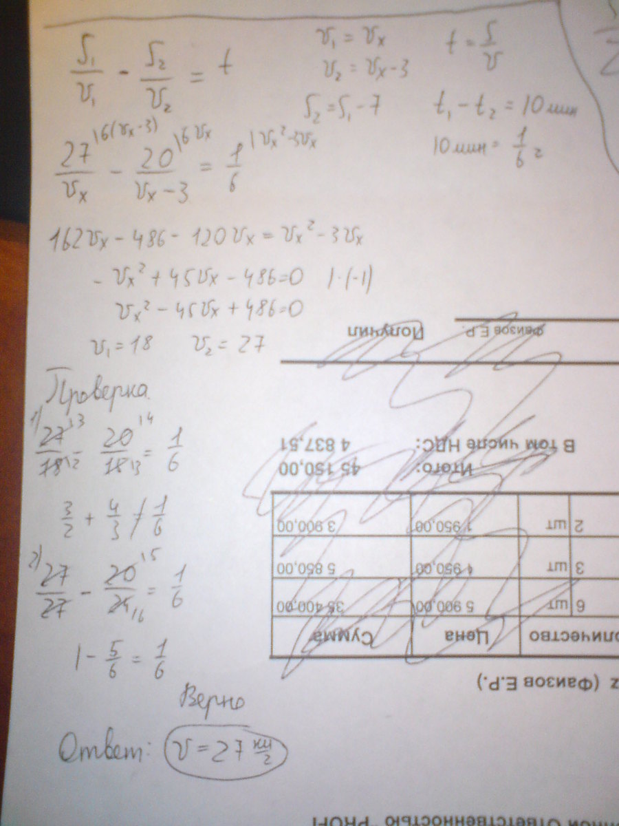 Из пункта А в пункт В велосипедист проехал по одной дороге длиной 27 км, а обратно возвращался по другой дороге, которая была короче первой на 7 км. Хотя на обратном пути велосипедист уменьшил скорость на 3 км/ч, он все же на обратный путь затратил времени на 10 минут меньше, чем на путь из А в В. С какой скоростью ехал велосипедист из А в В?