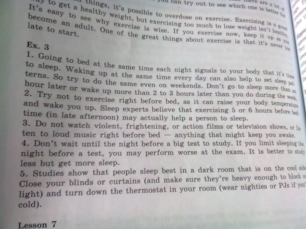 1. Если ты ложишься спать в одно в то же время каждый вечер, это сигнализирует вашему телу о том, что пришло время спать. Пробуждение каждый день в одно и то же время так же может помочь установить режим сна. Постарайтесь делать так даже в выходные дни. Не ложитесь спать более, чем на час позже, и не просыпайтесь более, чем на 2-3 часа позже, чем в течение недели.