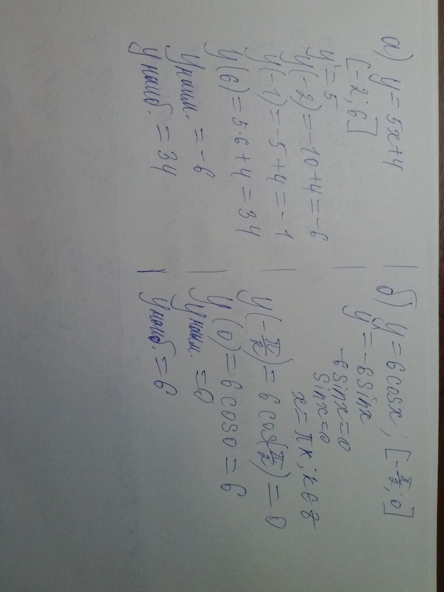 Найти наименьшее и наибольшее значение заданной функции на заданном отрезке : а)у=5х+4,[-2;6]