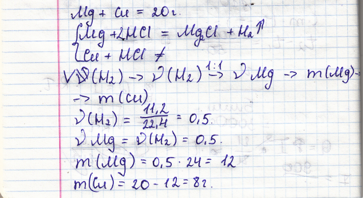Если нам дана смесь, то соляная кислота будет действовать на каждый из компонентов отдельно, поэтому составляется система реакции магния с кислотой и меди с кислотой. Газ будет выделяться только в одной из реакций (т.к. медь не вытесняет водород), а дальше см. рисунок