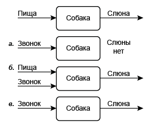 И схема самого опыта (см. рис.): до опыта, опыт и его результат — собака «путает» звонок и пищу.