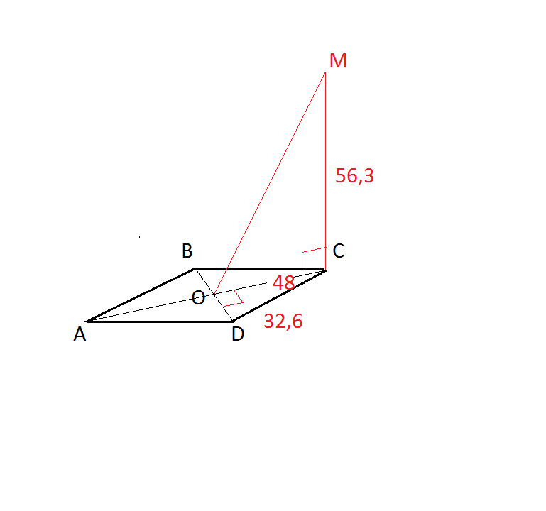 Дан ромб со стороной 32,6 см и углом 48*. Из вершины острого угла к плоскости ромба восставлен перпендикуляр длиной 56,3 см. Найти расстояние от вершины перпендикуляра до точки пересечния диагоналей ромба.