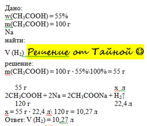 Какой объем газа(при н.у) выделится при взаимодействии раствора уксусной кислоты массой 100г (массовая доля вещества 55%) с металлическим натрием?