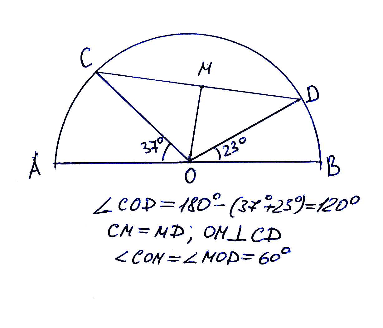 угол СOD = 180 - (23 + 37) = 120 градусов.