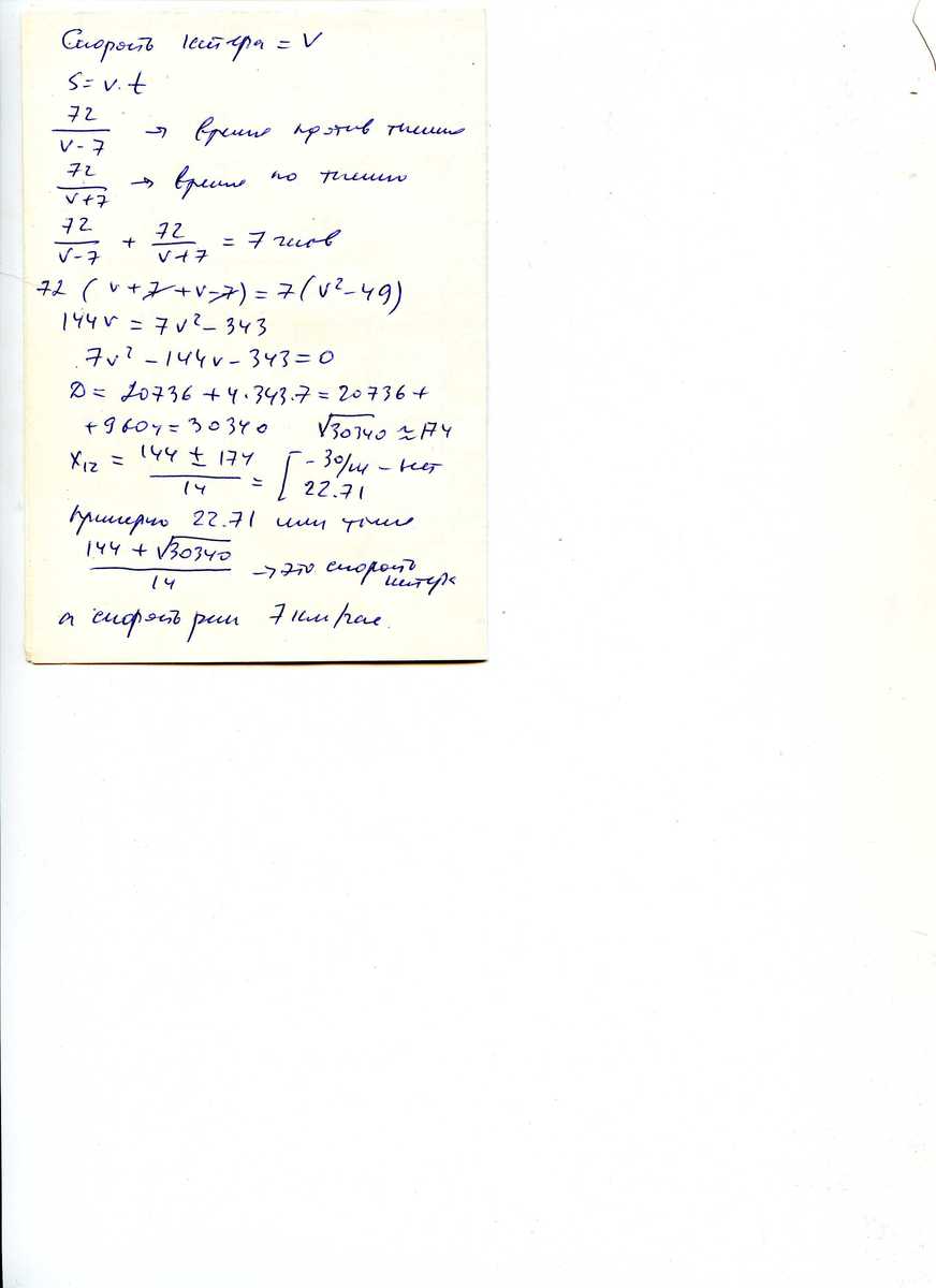 по течению реки катер проплыл 72 км,и столько же против течения реки.На вечь путь он потратил 7 часов.Скорость течения реки 7 кмч.Найдите скорость реки в стоячей воде.