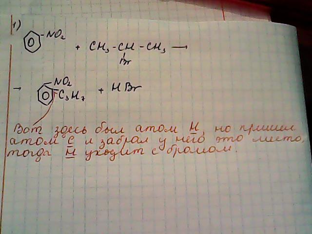 1)нитробензол + 2-бромпропан ---> метанитропропилбензол . правильно? а куда тогда девается бром?