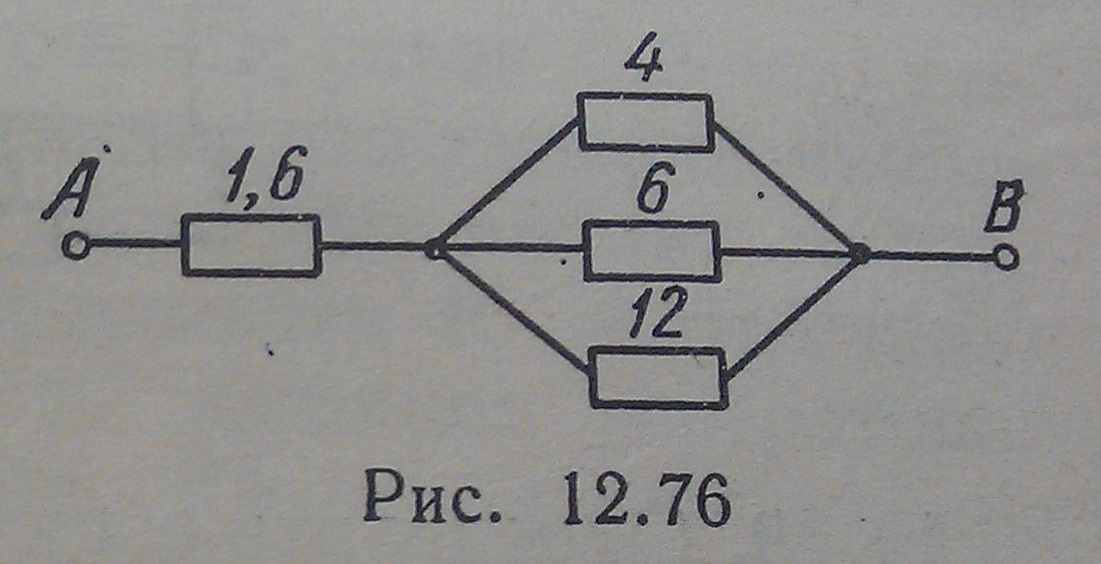 Помогите пожалуйста очень надо?? Четыре проводника соединены по схеме,приведённой на рис. 12.76. Напряжение между точками А и В равно 18 В. Определить общее сопротивление и силу тока в отдельных проводниках. Распишите подробнее с дано итп)