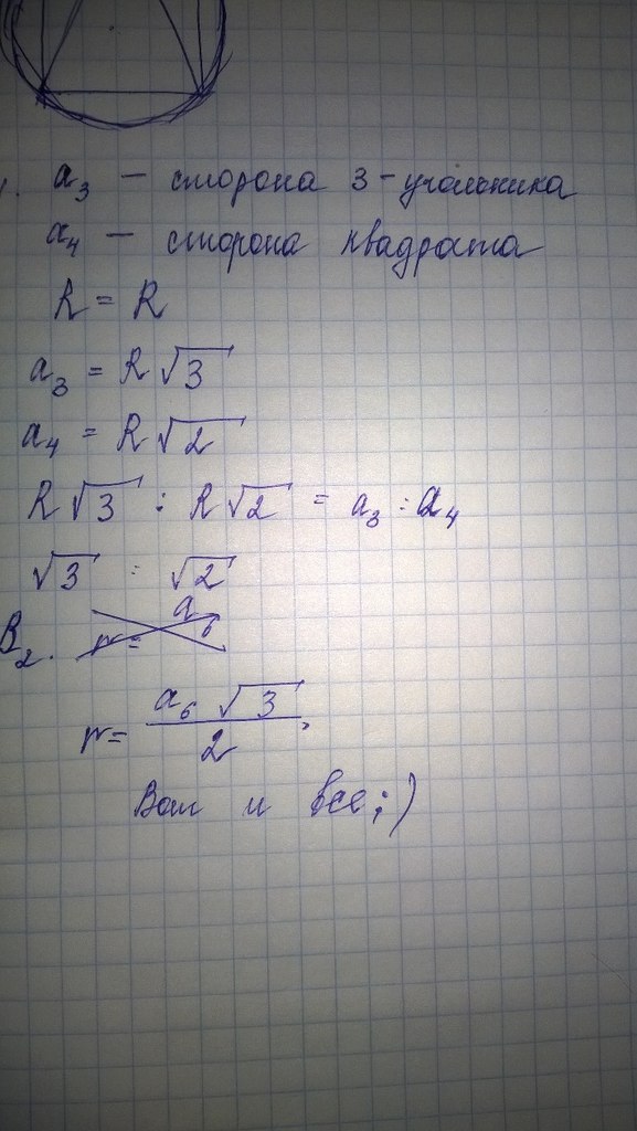 B1: В окружность вписаны правильные треугольник и четырехугольник. Чему равно отношение сторон треугольника и четырехугольника?