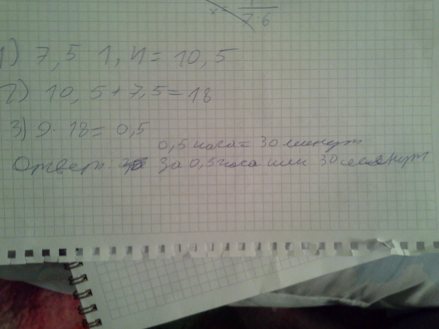 Из двух пунктов,расстояние между которыми 9 км,одновременно навстречу дру другу выехали на осликах два путника.Скорость одного 7,5 кмч.Второй в 1,4 раза больше первого.Через какое время они встретятся???