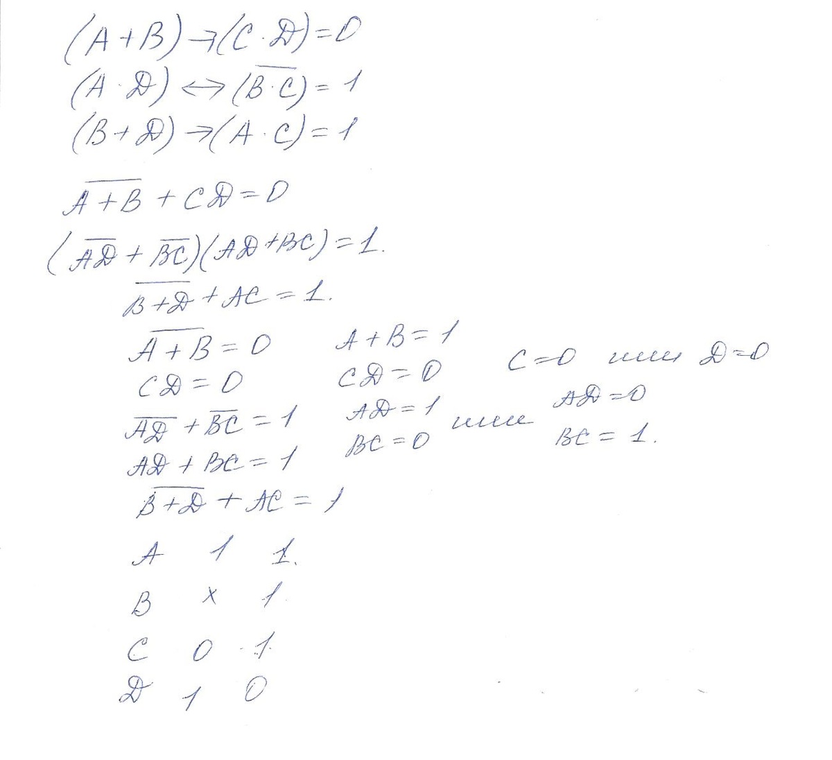 Известна истинность следующих логических выражений:(A or B) → (C and D) = 0(A and D) ↔ not (B and C) = 1(B or D) → (A and C) = 1Какие значения имеют в этом случае логические переменные A, B, C и D? В ответе укажитечерез запятую последовательность нулей и единиц в порядке ABCD, где единица обозначает значение «истина», а ноль – «ложь» (например запись «0,1,0,1» означает, что суждение A – ложно, B – истинно, C – ложно, D – истинно).