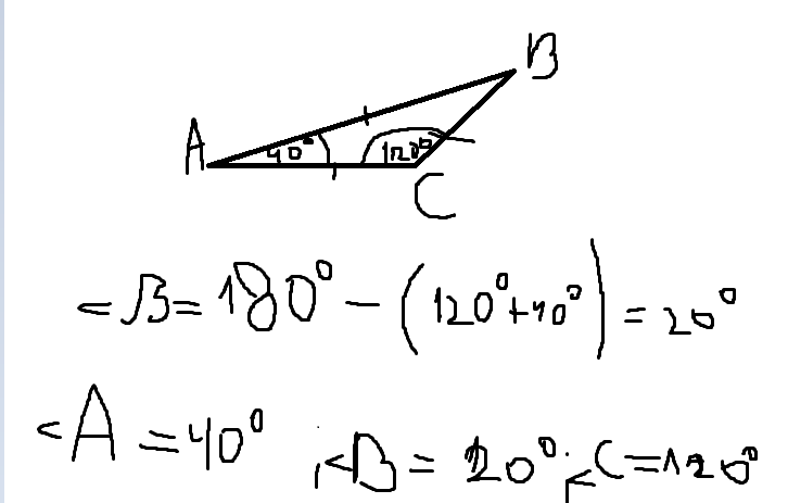 Один из углов треугольника АВС 120 градусов другой 40 градусов.