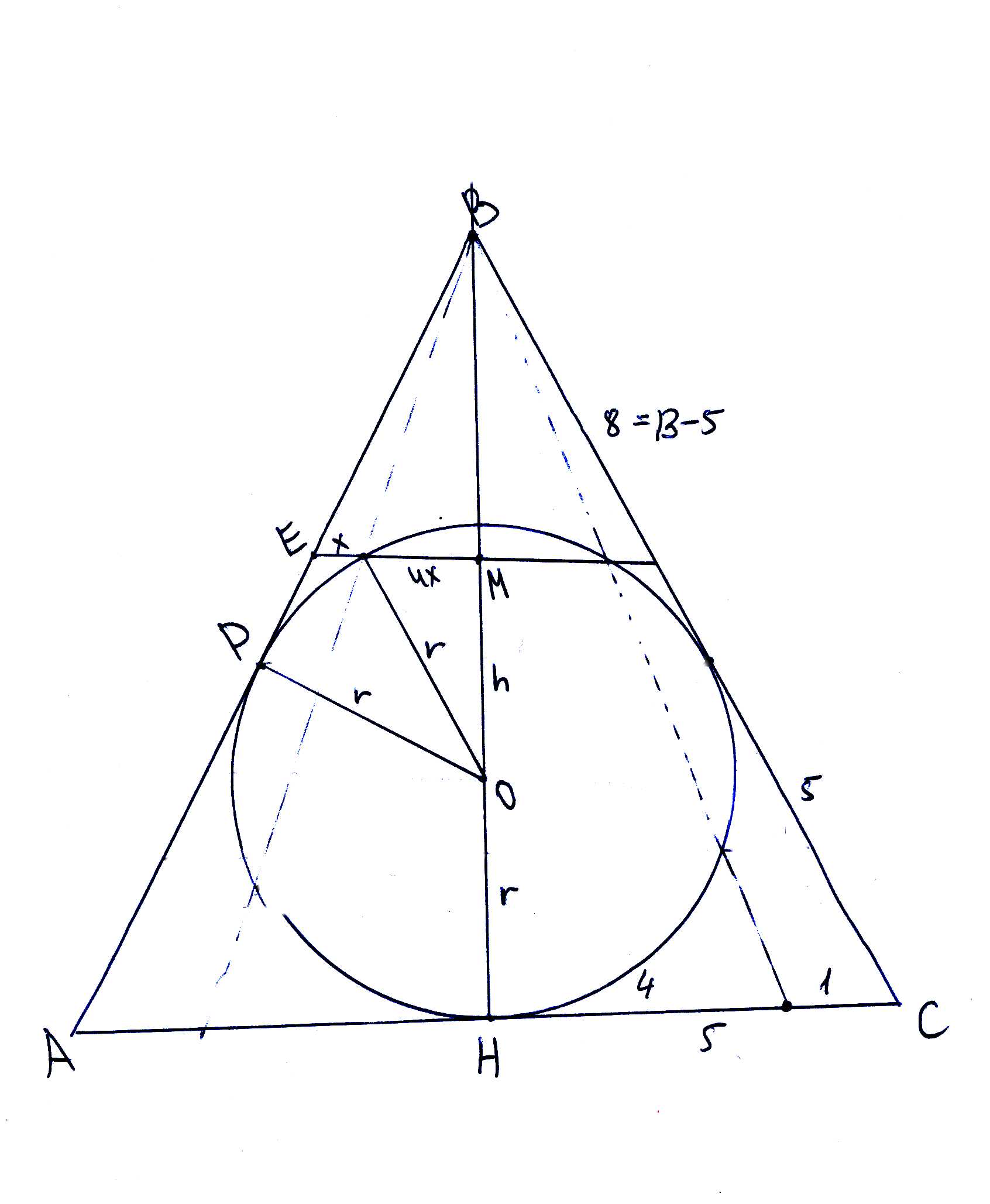 Следуя правилу избегать шаблонов, вычислим радиус вписанной окружности r = ОН, используя свойство биссектрисы АО.