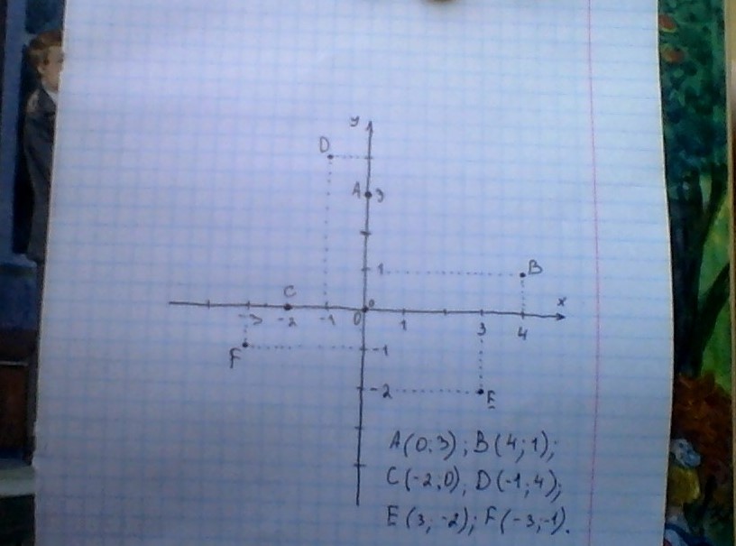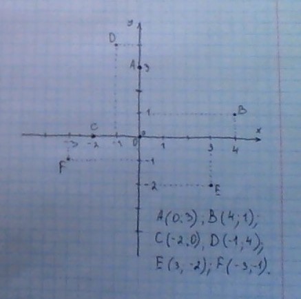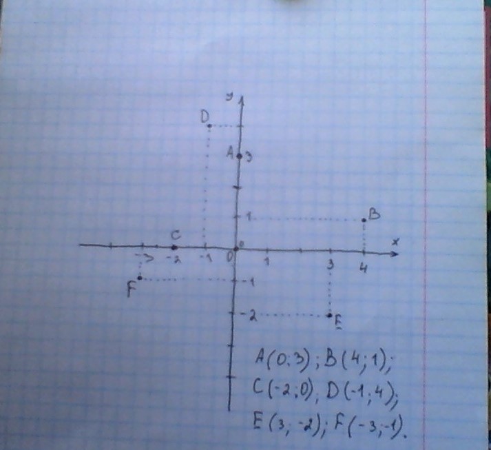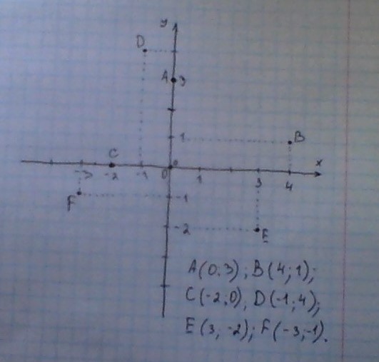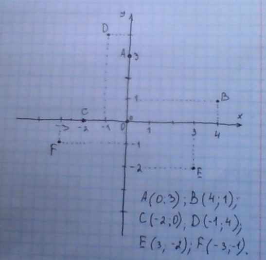 Начертите в тетради координатные оси взяв единичный отрезок длиной 1 см постройте точки A(0;3) B(4;1) C(-2;0) D(-1;4) E(3;-2) F(-3;-1)