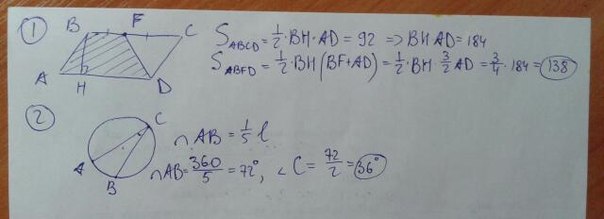 1) Площадь параллелограмма ABCD=92 см квадратных. Точка F - середина BC. Найти площадь трапеции ADFB.