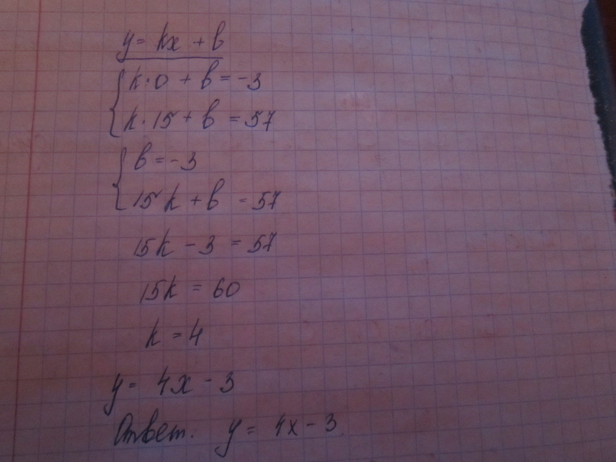 Запишите уравнение прямой и постройте эту прямую, если известно, что прямая пересекает ось y в точке (0;-3) и проходит через точку (15;57).