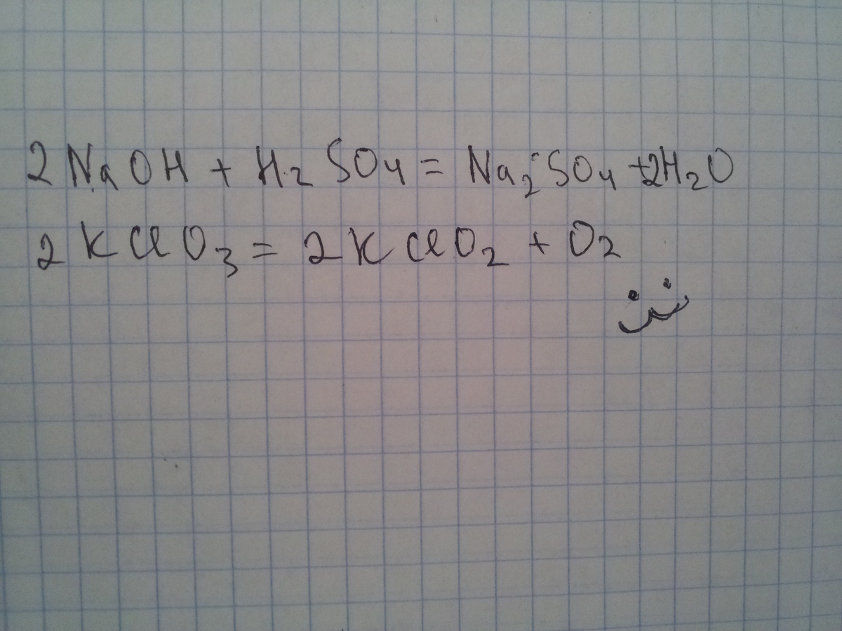 NaOH+H2SO4=Na2SO4+H2O K CLO3=KCL+O2 Расставьте коэффициенты в уравнении реакции и укажите правильный ответ с суммой коэффициетов для каждого уравнения в отдельности.