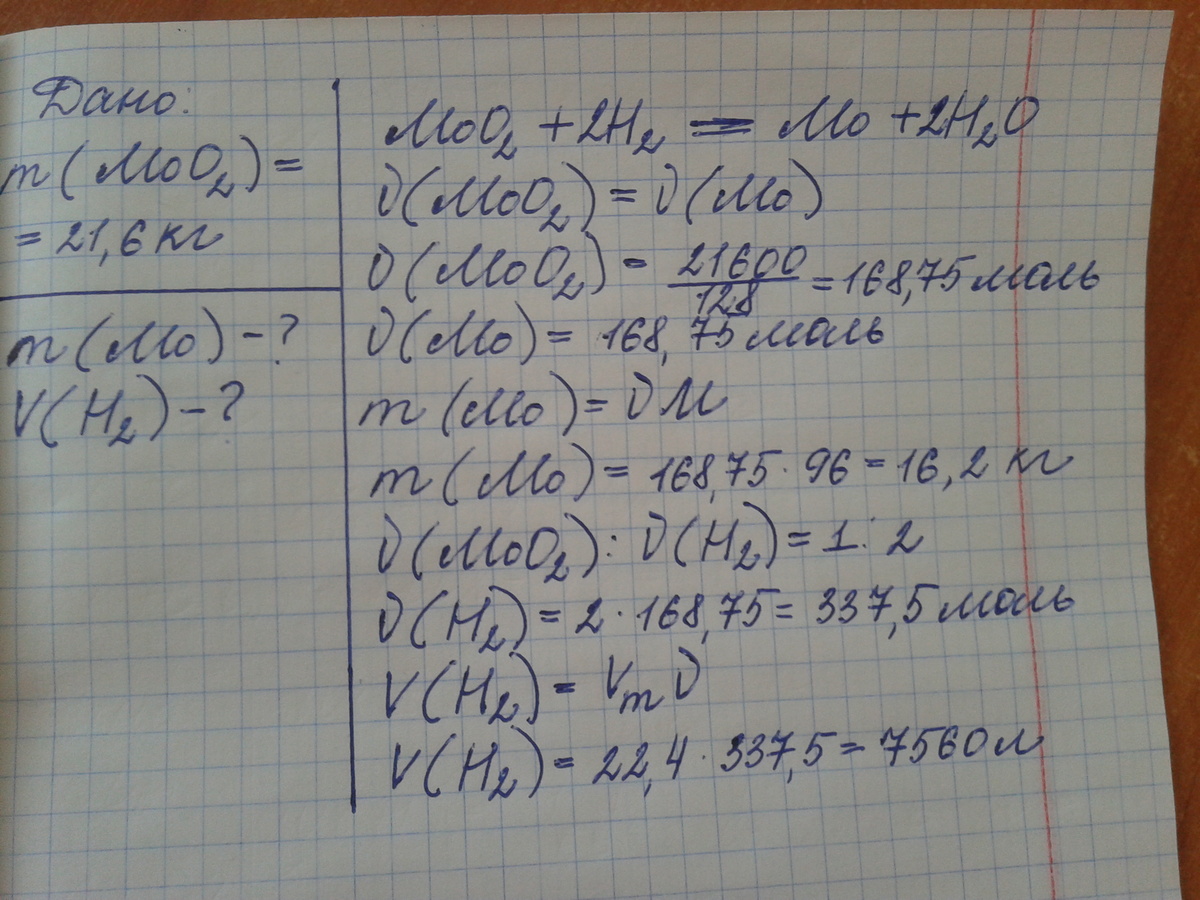 Вычислите массу молибдена, который может быть получен из 21,6 кг оксида молибдена 4. Учтите, что молибден получают, восстанавливая его оксид водородом. вычислите также объём водорода, приведённый к нормальным условиям, который потребуется для восстановления.