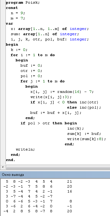 дан массив X(N,M). найти сумму тех строк массива, в которых положительных элементов больше,чем отрицательных. из полученных значений сформировать одномерный массив.