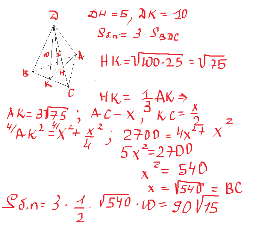 В правильной треугольной пирамиде высота равна 5,а апофема 10.Найдите площадь боковой поверхности пирамиды.