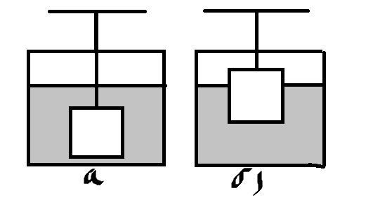 Алюминиевый кубик массой 2,7 кг, подвешенный на нити, вначале погружён в воду полностью (рис. а), а затем наполовину (рис.б). Чему равна сила упругости нити в обоих случаях?