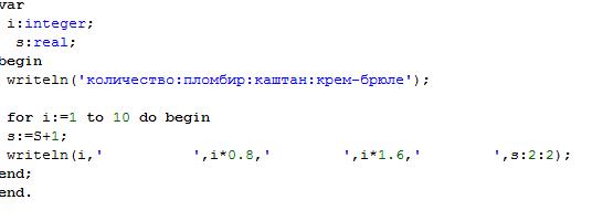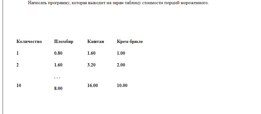 Написать программу, которая выводит на экран таблицу стоимости порций мороженного.